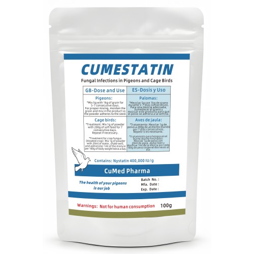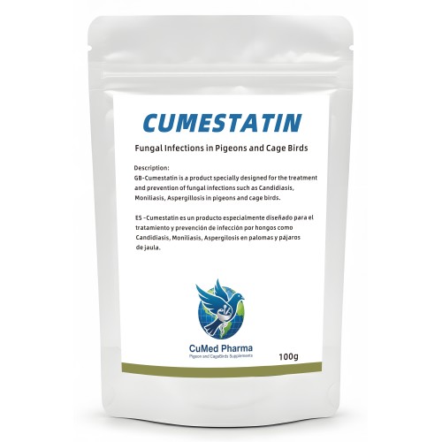 Cumestatin is antifungal treatment by CuMed Pharma, specifically engineered to eliminate fungal infections in racing pigeons and caged birds. Featuring pharmaceutical-grade active ingredients, it effectively inhibits the growth of fungi and yeasts that compromise digestive health, ensuring peak performance and overall avian well-being.