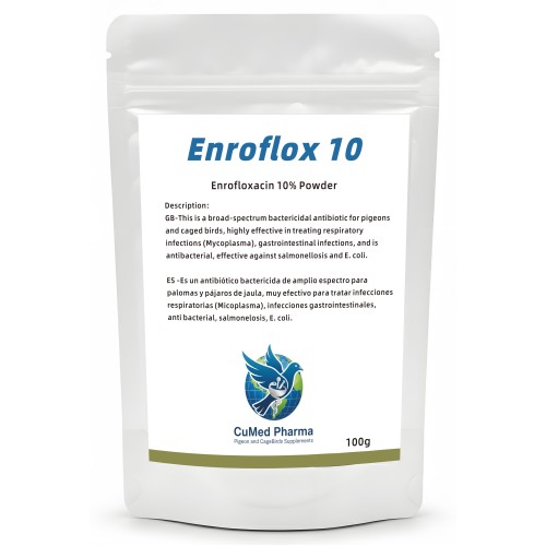 Enroflox 10 100g is water-soluble bactericidal antibiotic by CuMed Pharma, featuring 10% Enrofloxacin. This potent agent is specifically engineered for racing pigeons and caged birds to provide a decisive defense against severe bacterial and protozoal infections, ensuring birds maintain peak condition.