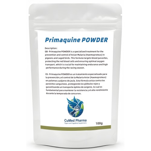 Primaquine POWDER 100gr de CuMed Pharma para la prevención y el control de la Malaria Aviar (Haemoproteus) en palomas y pájaros de jaula. Esta fórmula actúa contra los parásitos sanguíneos, protegiendo los glóbulos rojos y garantizando un transporte óptimo de oxígeno, lo cual es fundamental para mantener la resistencia y el alto rendimiento durante la temporada de concursos.