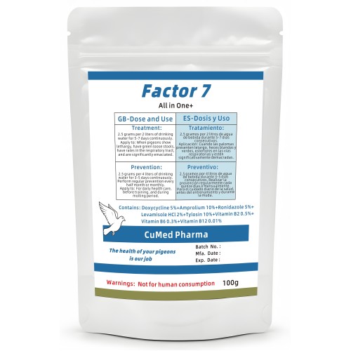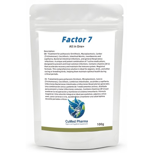 Factor 7 is a masterful "All in One+" solution by CuMed Pharma, specifically engineered for the high demands of racing and breeding birds. This unique formula combines 7 active medications with Vitamin B12 to provide a comprehensive defense against various infections. It accelerates recovery and supports the immune system, ensuring birds maintain peak physical condition during critical periods.