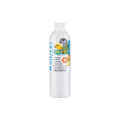 Multivet 250ml by Vetafarm was formulated by avian veterinarians to supplement the diet with essential vitamins, minerals, and nutrients to assist in maintaining general health and feather development.