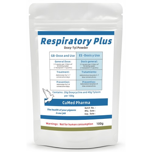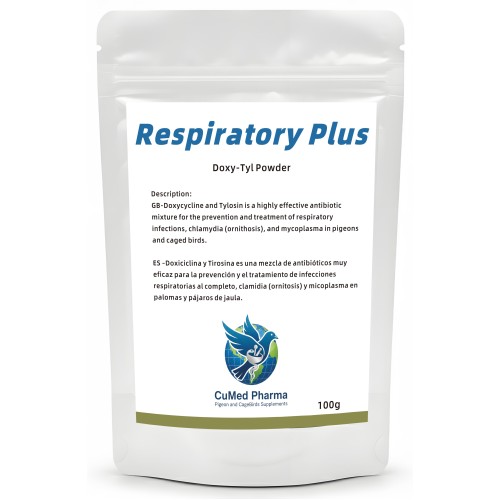 Respiratory Plus 100g by CuMed Pharma It is a highly effective blend of Tylosin 40% and Doxycycline 20% (Doxy-Tyl) for treating infections of the entire respiratory tract.. This water-soluble powder provides a fast-acting clinical response to severe respiratory ailments and infections in racing pigeons and caged birds.