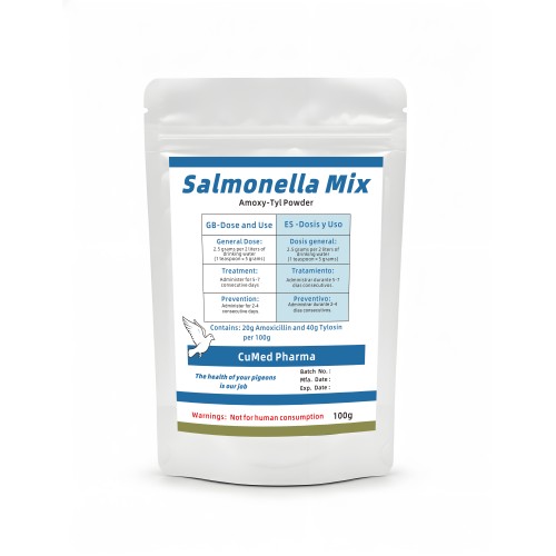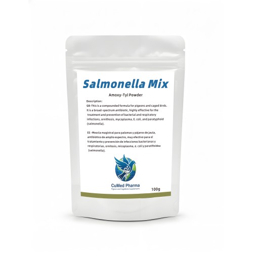 Salmonella Mix 100g is a broad-spectrum antibiotic from CuMed Pharma, designed as a Amoxy-Tyl Powder antibiotic. This water-soluble powder is specifically engineered for racing pigeons and caged birds, providing an effective clinical response to severe bacterial and respiratory infections.